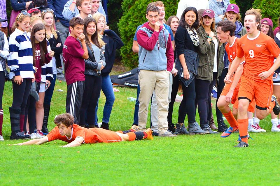 Junior Jesse Sobotka launched the ball into the box in an attempt to force a long rebound that another Eagle could clean up. A Riverdale defender failed to boot the ball out and junior forward Ben Gottschalk zoomed in to score, evening the game at one goal apiece. The Riverdale crowd went silent as Gottschalk proceeded to sprint across the field and slide headfirst past the faces of Falcon alumni as his teammates swarmed him. Riverdale’s players stood in disbelief; just a moment ago they had all but sealed a victory. “When I scored the tying goal, I just started running towards the sideline,” recounts Gottschalk. “The feeling was almost unexplainable.”