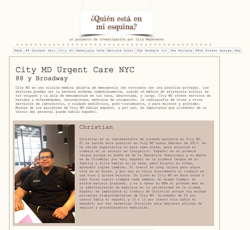 The individual projects covered a huge spectrum of themes and mediums: an artistic response to Hispanic museums and art in New York City; a study of the culture and history of the arepa; three documentaries: one exploring the mixture of culture and language at Fieldston (http://goo.gl/LD4vQN), one about the Nuyorican Poet’s Café, and one about the experience of undocumented immigrants in New York City; learning salsa and teaching the dance at Ethical Culture; a photo essay of three New York neighborhoods from the perspective of three Latino athletes; interviews about the lives of eight different Spanish-speaking employees on the Upper West Side (http://goo.gl/mXBJoz); student teaching with Señora Mella in Fieldston Lower School; learning about Dominican cuisine from an expert and preparing the dishes for the community; “Humanos de Nueva York,” a photo essay of Latino New York (http://goo.gl/HEi6iQ), and more.
