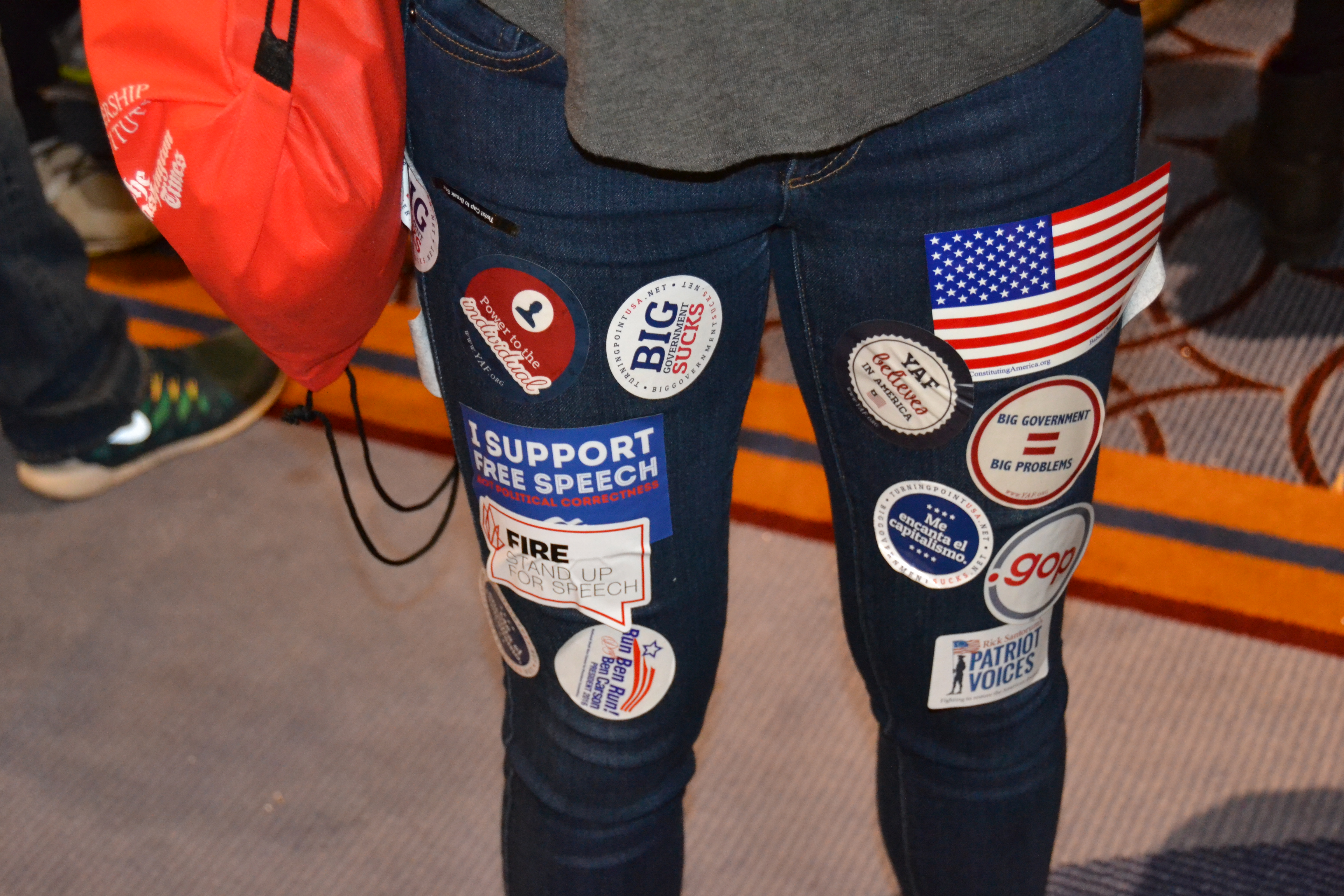 Photo by David Fishman: A student’s legs covered in stickers handed out at CPAC