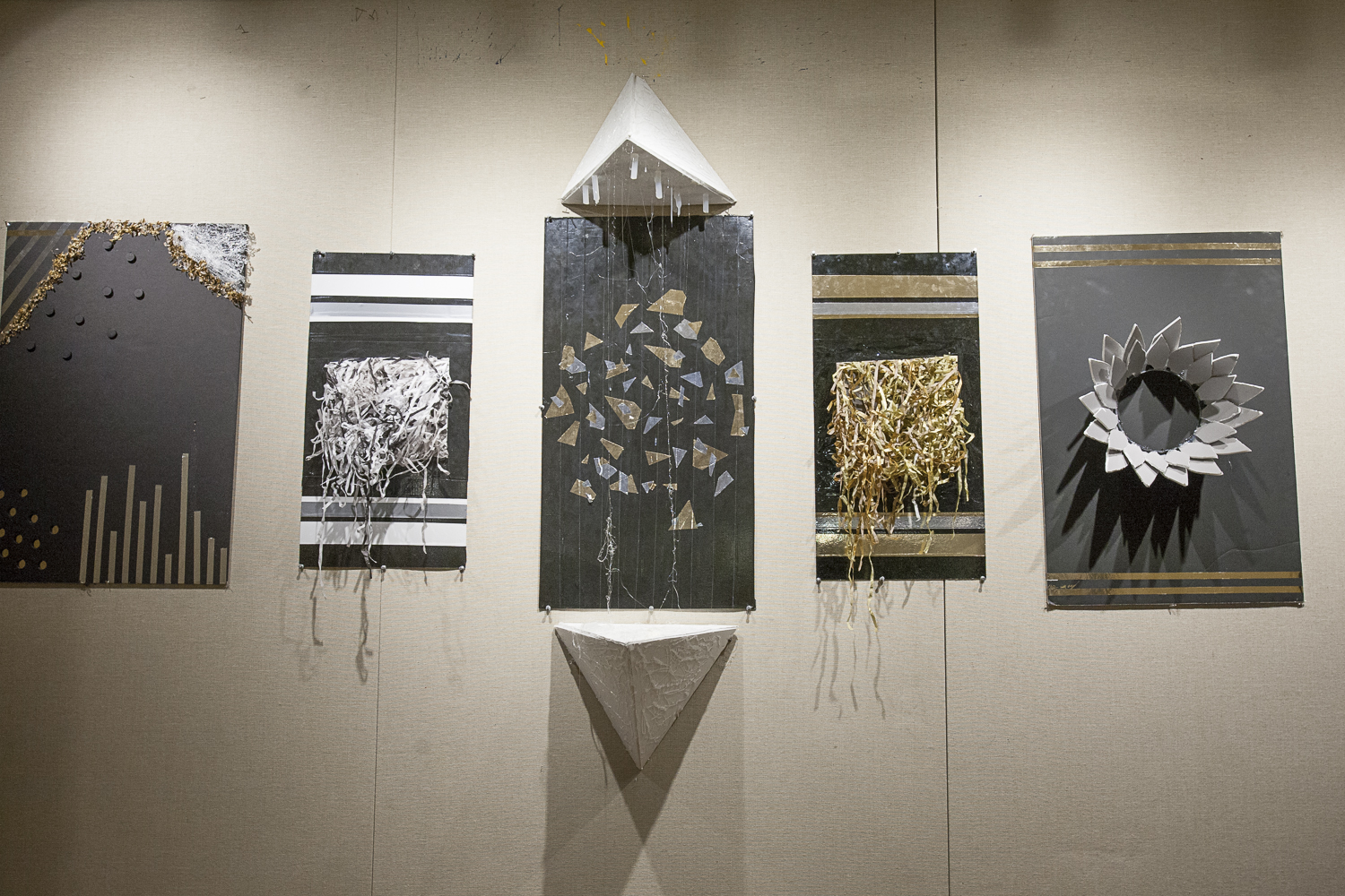 In March, we departed from the collaborative approach and the students were directed to develop individual work utilizing only the materials that we had used from the earlier units. Moreover, our theme of Influence & Inspiration , which we had loosely examined earlier in the year, was now to play a more significant role in the development of their ideas. In April, I brought each of my classes over to see the gallery space (and the other various art studios) the hope was that this visit would help peak further interest in their individual creative endeavors. Almost every student has an individual piece in the show (there are approximately 130 students in the grade) and the work in the gallery is a combination of collaborative pieces and pieces that were made by individuals. While we worked with a fairly wide range of materials, the palette of colors that we used was limited to black, white, grays, and metallics. One 6th grader, Tatiana Wolkowitz, describes her experience being in the art show:“The process of creating a piece wasn’t easy. First was the idea. A good idea was essential to creating a masterpiece so it was important to make sure it was a solid concept. Next came the materials. Should we paint the canvas gold, or silver? Should we glue on shells, or mirrors? Should we use hot glue, or not? Lastly came the actual constructing. In my opinion, the constructing was easier than the planning because it was a chance to truly be creative and make the piece our own. While in the process of creating, we were told to think about inspiration and influence. I, myself, chose to create a sculpture. At first I had shattered some mirrors so I had used them in my piece, and I also painted on the board. My inspiration for this piece was the way we all view ourselves. The shattered mirrors gave the effect of a distorted reflection. I had also used silver tape to make my reflection appear smeared. I loved creating this piece because it gave me the chance to work with materials I haven’t used before. Overall, the pieces were fantastic, and the art show looked fabulous, thanks to all the hard work that was put into these works of art!”