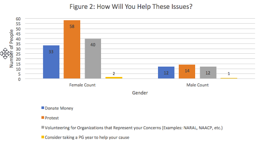 Interestingly, males and females exhibited different levels of commitment to actively protesting the Trump administration. Many more females seemed to be willing to participate in protesting as compared to males.