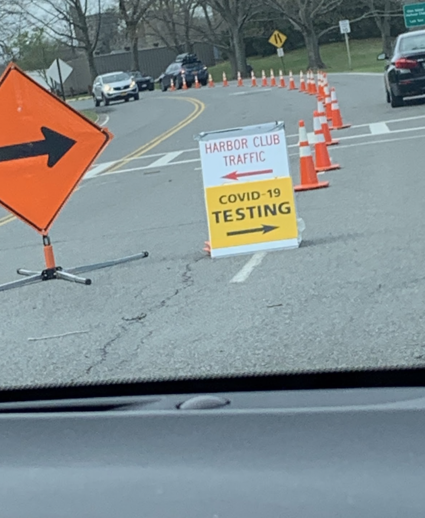 After going around a bend in the road where the view is obstructed by trees, a huge compound of white tents became visible. What makes these tents seem so out of place is the beautiful scenery surrounding it. Just across the water is the Harbor Club, a large country club. In the largest of these tents, a stockpile of medical supplies is visible, primarily crates of COVID-19 tests. At every stop thus far, New York State Troopers made it abundantly clear to the passengers of each car, “Do not roll down your car windows.” The line of cars continued to drive through Glen Island and my family’s car had nearly reached the third checkpoint station, at which point I was approached by a State Trooper who told me that photography of any kind is banned on the island, and he insisted that he watch me through the car window as I deleted the photos that I had planned to use for the purposes of this article. After doing so, he looked at me – still through a closed window – and said, “now delete them from your recently deleted photos.” I was told that the trooper was following the protocols involving a “medical procedure where the rules of privacy come into play, and the representation of an individual without their consent is unethical” I did manage to take one photo, later on, on the road leading off of the island, that involved objects and not people. Despite this nerve-racking experience, we continued to the checkpoint where we verified our identities. We were only a few hundred feet from the tent, next to where drive-through tests are performed. One volunteer traffic guard seemed to notice the concern on our faces, and cracked a joke through our car window, “I used to coach NASCAR.”