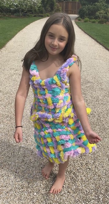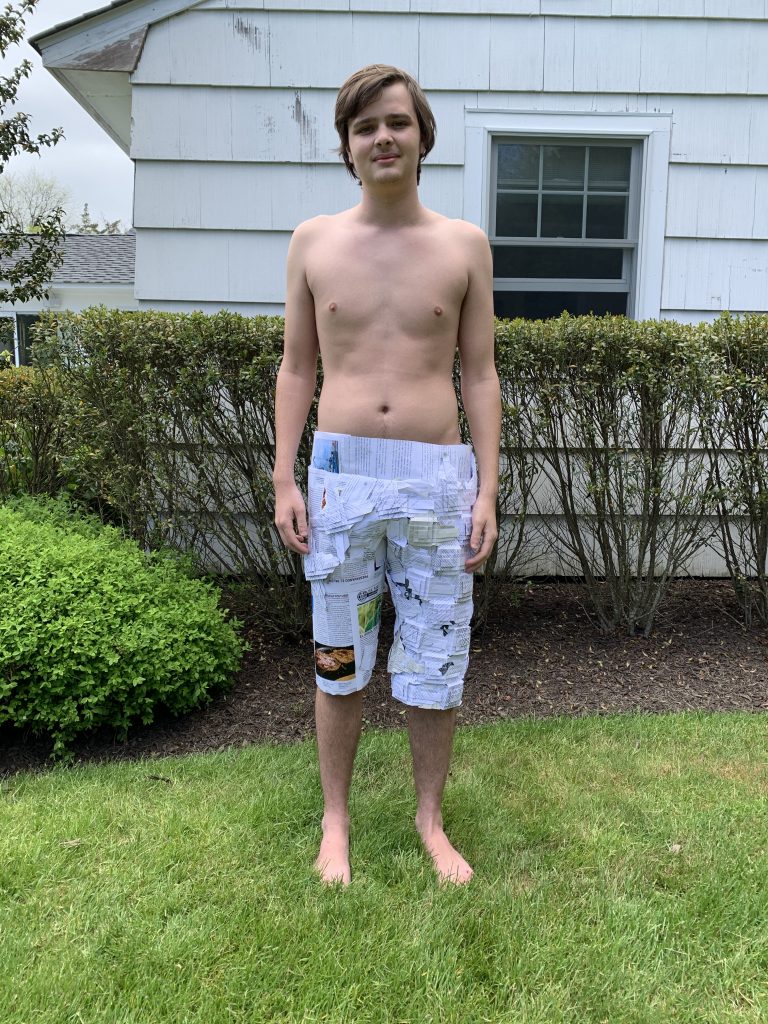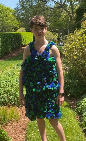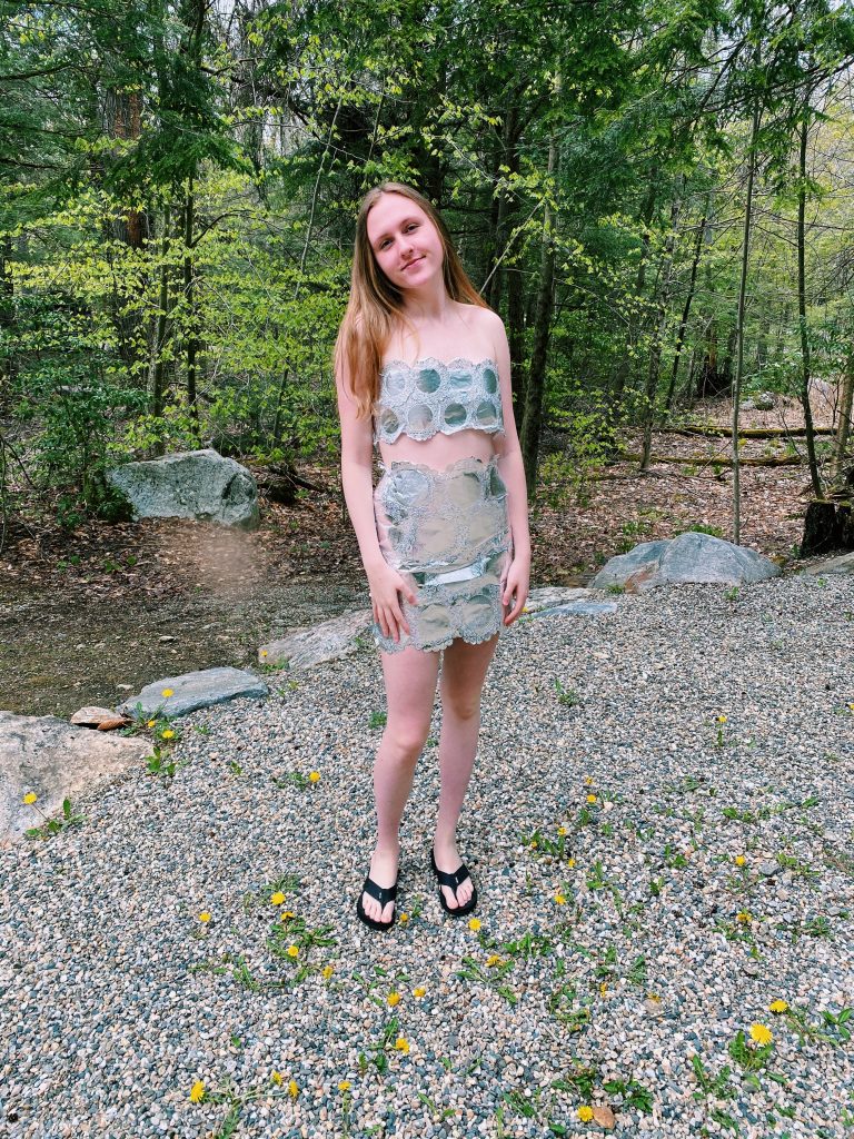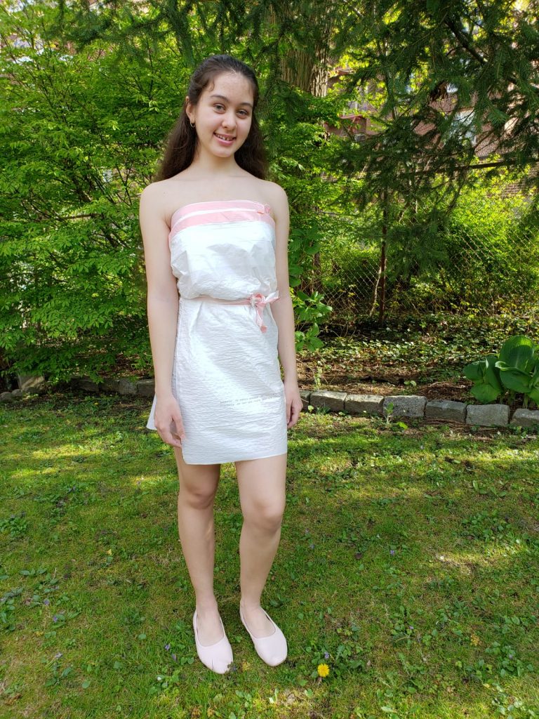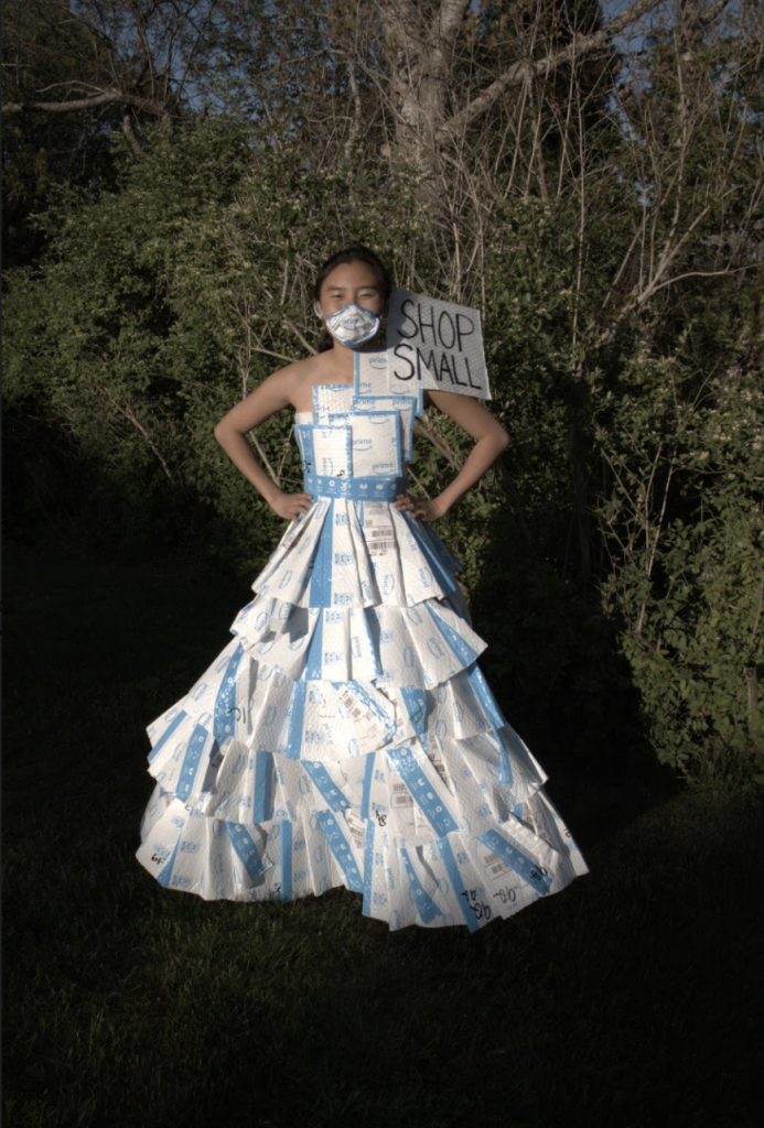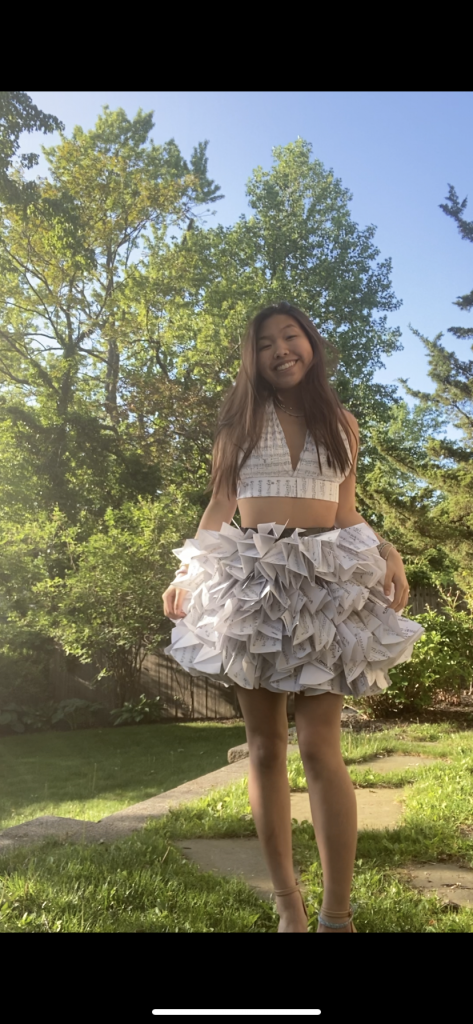 COVID-19 forced many designers to make changes based on access to tools and materials. However, this change flowed nicely with the spirit of the Fashion Show, since creativity and unconventional materials have always been a focus. For example, Skyler Moses (V) made a dress out of baby wipes because they were available where her family was staying.