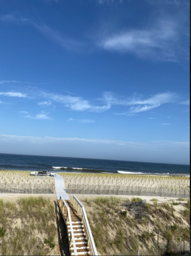 This photo was taken on August 2nd, 2020 in Bay Head, New Jersey. From this vantage, you can see the stairs down to the beach leading to the dunes and the ocean waves.
