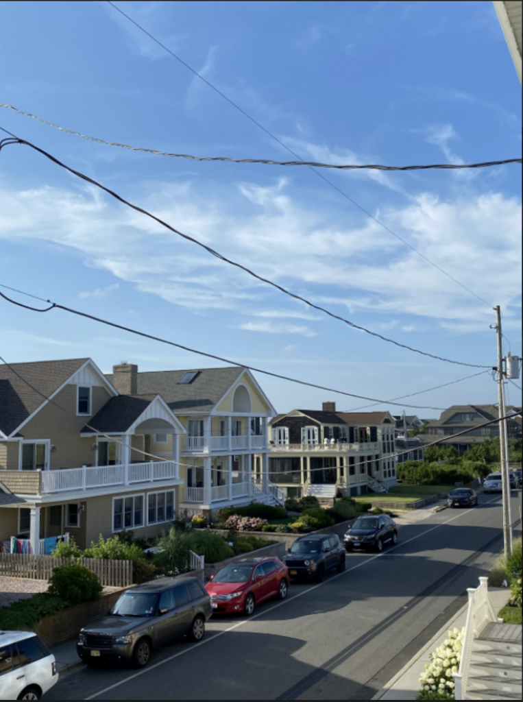 This photo was taken on August 2nd, 2020 in Bay Head, New Jersey. From the third story of a beach house, there is a prime view of the street and cars below.