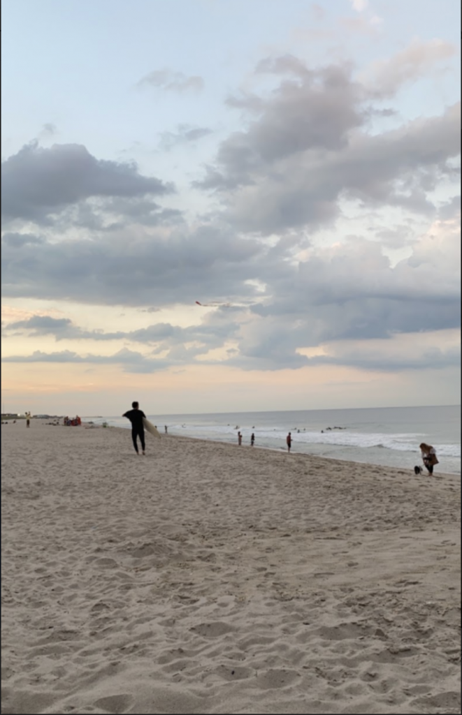 This photo was taken on July 28th, 2020 in Bay Head, New Jersey. A surfer exits the water, packs up their gear, and leaves the beach at dusk.