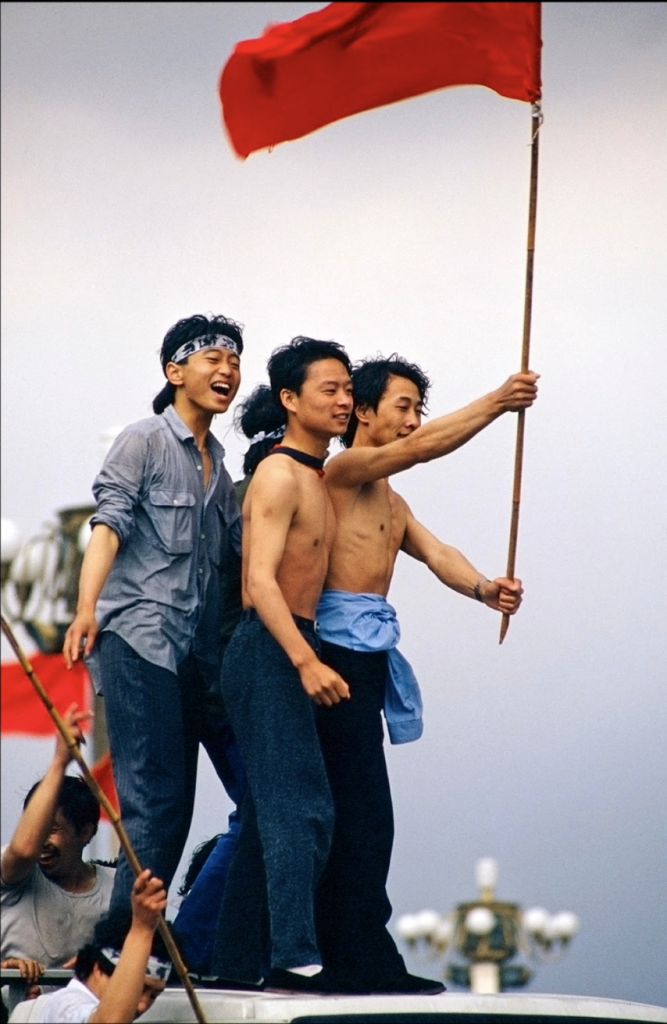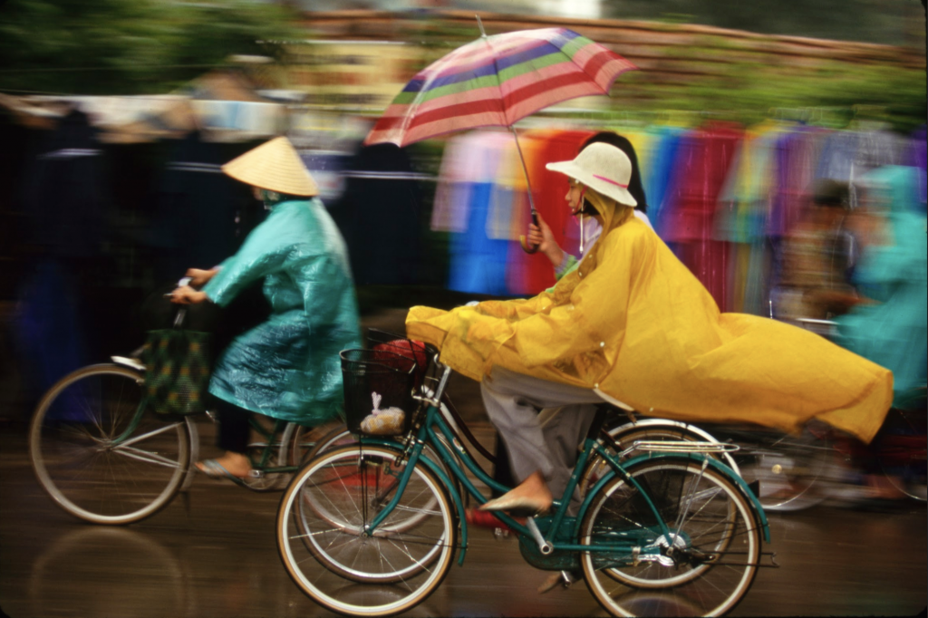 When asked about the photos she likes the most, she describes the mystery in a photo she took in Russia of a girl with a patterned dress with a medicine ball in a dark alley, mentions her famous photo of Tiananmen square depicting shirtless boys holding flags mid rain, speaks with pride about her double page spread in Life Magazine of a photo she took after the Hebron massacre, and points out the vivid colors of her photo of a woman in a bright yellow raincoat raising a colorful umbrella while biking in Vietnam.
