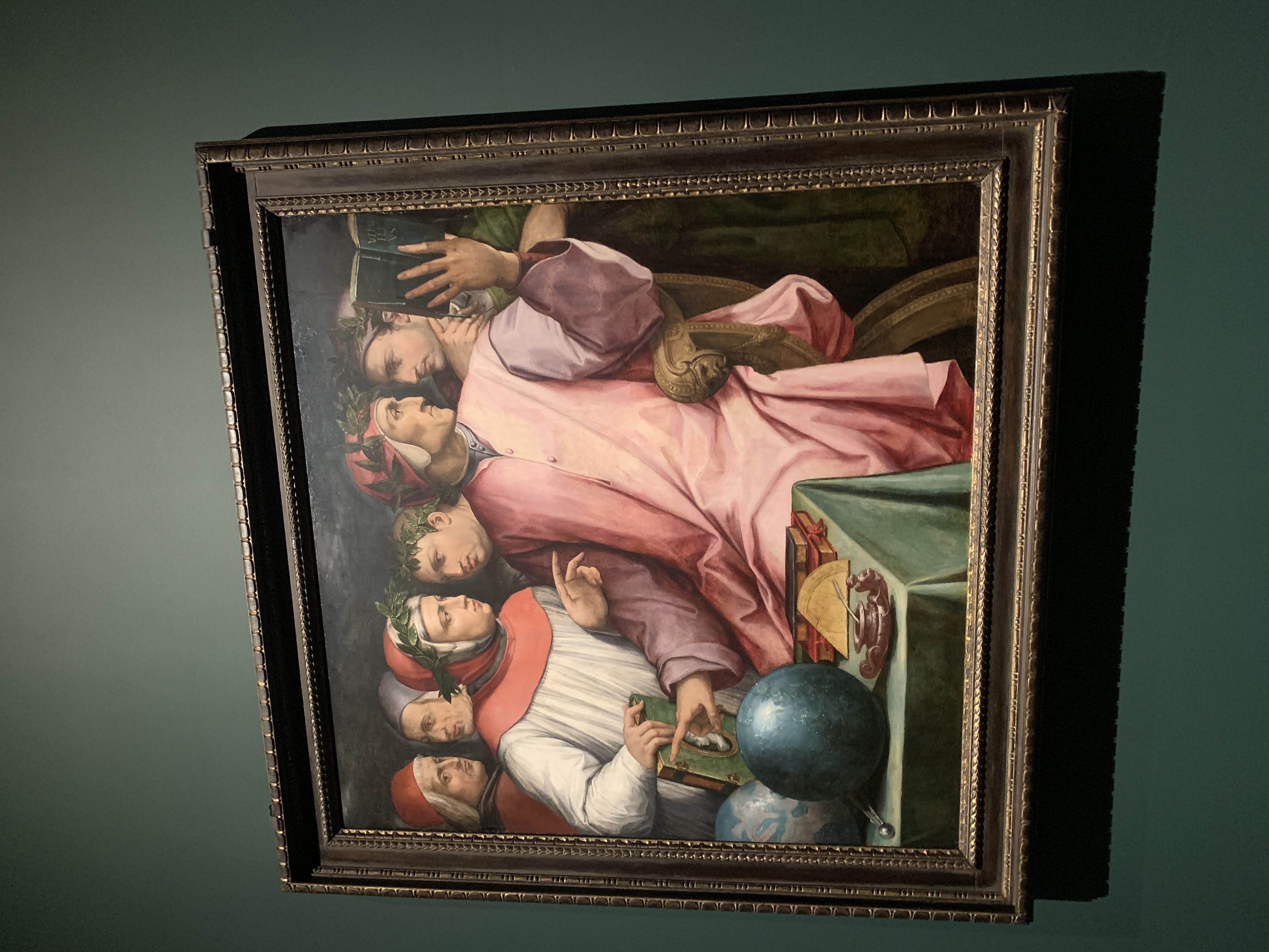 The subsequent two galleries look at Florentine Academia, one with a focus on the significance of literature, particularly poetry at the Accademia Fiorentina – a distinguished literary institution founded and funded by Duke Cosimo to further his artistic/cultural agenda – and the other focusing on how Duke Cosimo meticulously crafted the image of his duchy to be cradle of cultural rebirth. With fourteenth-century poets Dante and Petrarch at the center of attention, portraits depict words, authors and book titles to signify a sitter’s patriotism, social association, literary expertise, even political affiliation. As the byproduct of an intensely literary culture, artists embraced classical allegory and metaphor of their predecessors which can be seen through “disguised portraiture” in which sitter’s are depicted as a mythological figure. In the final gallery, the painters which dominated the exhibit and 1540s Florence, Francesco Salviati and Bronzino are shown in tension and comparison. The stylistic juxtaposition shows Bronzino’s portraits presenting a naturalistic, sensible style alongside Salviati’s illustrated and extravagant style.