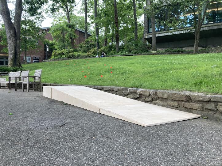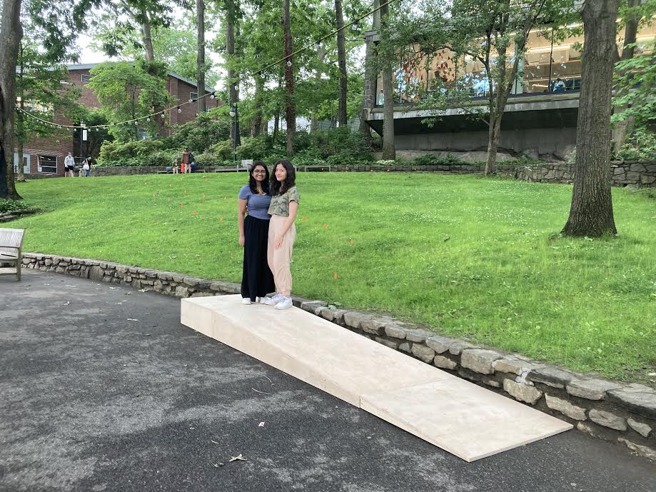 Fieldston Upper School Juniors Arshie-Amelie Chaudry and Chantel Mager this past semester worked under the mentorship of Upper School Architecture teacher Marc Ganzglass to build and install an ADA approved wheelchair accessibility ramp for the Fieldston campus. Chaudry and Mager’s project statement says “Our school mission statement is ‘at the Ethical Culture Fieldston School, we are committed to diversity — including diversity of race and ethnicity, sexual orientation, gender identity and expression, socioeconomic status, disability status, religion, and culture.’ However, our lack of elevators and ramps show that we are not truly accessible for those with physical disabilities.”