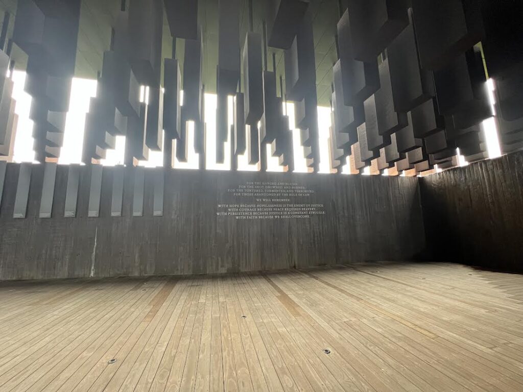The trip was centered on a couple of key destinations. The first day we visited two monuments by the Equal Justice Initiative (EJI), The Legacy Museum: From Enslavement to Mass Incarceration, and The National Memorial for Peace and Justice. EJI was founded in Montgomery by famous litigator and author of Just Mercy, Bryan Stevenson. EJI provides high quality legal representation to prisoners who are victims of wrongful conviction, impoverished prisoners who cannot afford adequate legal counsel and those who have been denied fair trials. We started the day with The Legacy Museum, an immersive journey through Black history, persecution and resistance, through art and not artifacts: documentary shorts, animated shorts, sculptures, holograms and music. The Museum was a perfect segue into the Memorial–a square of 800 iron monoliths suspended from a ceiling, each representing a county where people was lynched. After an hour of independent reflection in the Memorial, we crossed the street to an EJI auditorium to meet Law Fellow Laurel Hattix. Just a few years out of Law School, Hattix was able to squeeze us into a packed day to enlighten us about her work, her views on the criminal justice system, and her advice to aspiring activists. She blew us away.