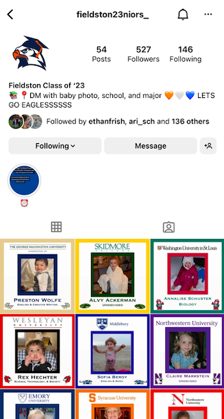Ah… The Fieldston Class of ‘23 Instagram account. Known and loved by many. Run by Izzy Casdin (VI), the account is a way to celebrate the seniors on their accomplishments and commitment to a college. For those unfamiliar with the account or not on Instagram, each post consists of a baby photo, school and major. The captions and comment sections are always filled with love, celebration and inside jokes.