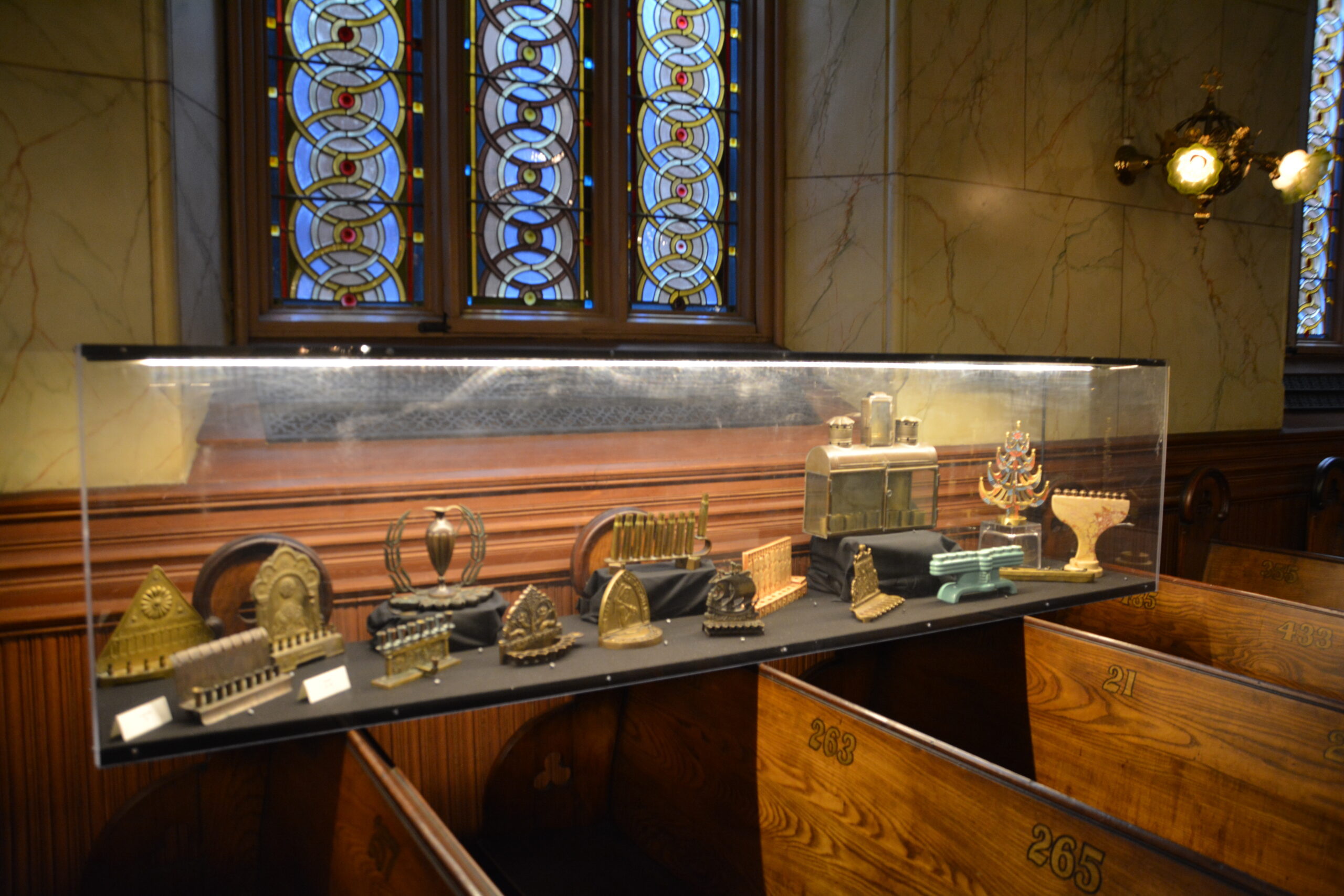 The basement held one of the museum’s temporary exhibits.  The exhibit took mezuzahs from all over the world.  Mezuzahs have prayers or verses from the Torah in them, and Jews put them in their door frame.  A personal favorite was one of a ceramic couple that was given as a wedding gift.  I pointed it out to Ms. Paterson and she said, “They must know how to party! “ I cracked up and we all agreed that their wedding must have been a fun one.  After a final look at the mezuzahs, Scott led us up to the main floor and to the sanctuary.
