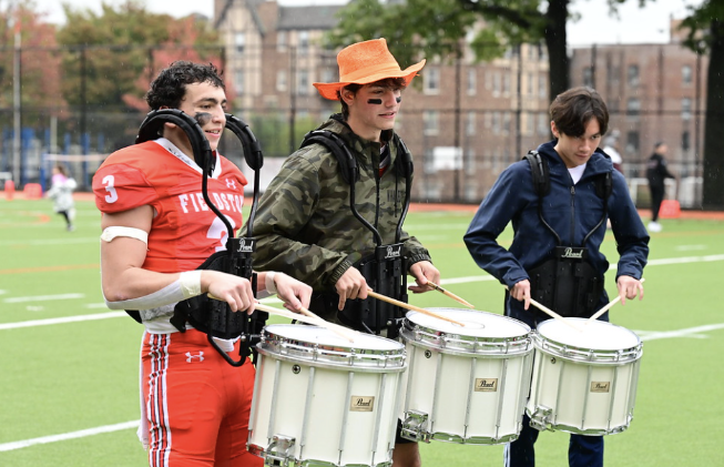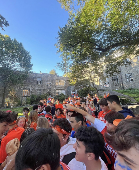 The week started off with expressions of spirit across all grades. Each day packed an added punch. Wednesday, October 11th was Jersey Day! Everyone came to school in their favorite sports team’s jersey or shirt. Students had lots of fun talking about their favorite teams and representing them throughout the day. Thursday was Blackout Day for the Freshman, Sophomores and Juniors, while the Seniors had Neon Day. This day is important to highlight our class of ‘24 Seniors with neon colors! Finally, Friday, the most exciting day of the whole week, Pep Rally day! Pep Rally is really where choreography meets fashion and art, underscored by sheer pandemonium. It’s a collective culmination. Everyone comes to school in their favorite Fieldston merch. We start the day by getting off the buses to be greeted by all the seniors! They have shaving cream and blue and orange hair spray and they spray students with it as they walk into school. It is so much wild orchestrated fun.