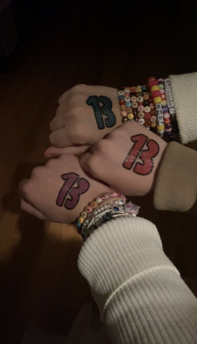 Mia: My theater was also pretty quiet, and my 12-year-old cousin and I were definitely the loudest ones there. We wore our Era’s tour concert shirts and flannel pajama pants. We drew 13s on our hands with eyeliner and colored them in with eyeshadow. Although we purchased a large Taylor Swift popcorn bucket, we barely had time to eat it since we sang the whole time.