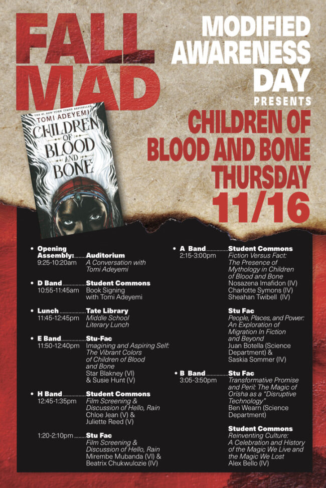 After announcements, Upper School Principal Stacey Bobo made a brief statement, acknowledging that “sometimes when we have speakers come up and share perspectives, that it doesn’t always land on everyone comfortably.” Although student and faculty-led MAD workshops at the upper school proceeded as planned, Adeyemi’s middle school literary lunch, scheduled for 11:45-12:45 in the Tate Library, was canceled. According to multiple community members who attended the Assembly After Dark, Adeyemi delivered an identical presentation on Wednesday night (November 15th), yet it did not ignite the same audience responses.