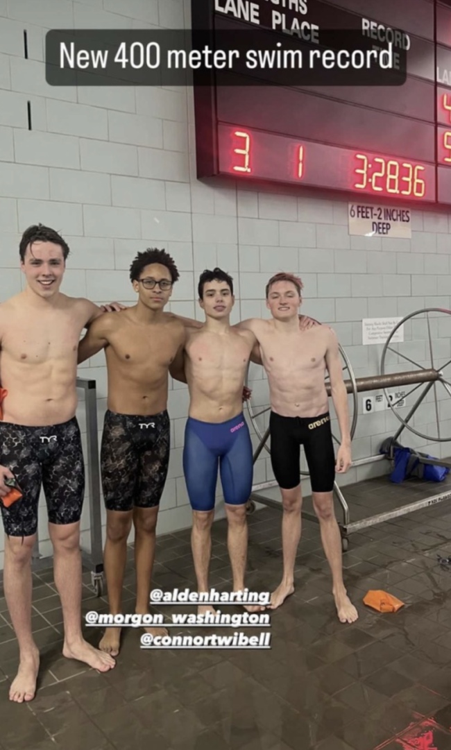 Earlier this month, four current members of the swim team experienced these feelings of joy as they created a new school record. On Monday, February 5th, Alex Babej (Form IV), Alden Harting (Form VI), Morgon Washington-Patterson (Form V) and myself (Connor Twibell, Form VI) came together to complete the Boys 400 Freestyle Relay in 3:28.36, beating the school record of 3:33.21 that had stood since 2019. While swimming may not seem like a team sport, breaking a relay record is a tangible reward for working together as a collective unit. As Washington-Patterson, the relay anchor, smacked the wall with more than four seconds to spare, cheers erupted and the camaraderie between the four swimmers was palpable. “Words could not describe how I felt when I touched the wall,” Washington-Patterson recalled.