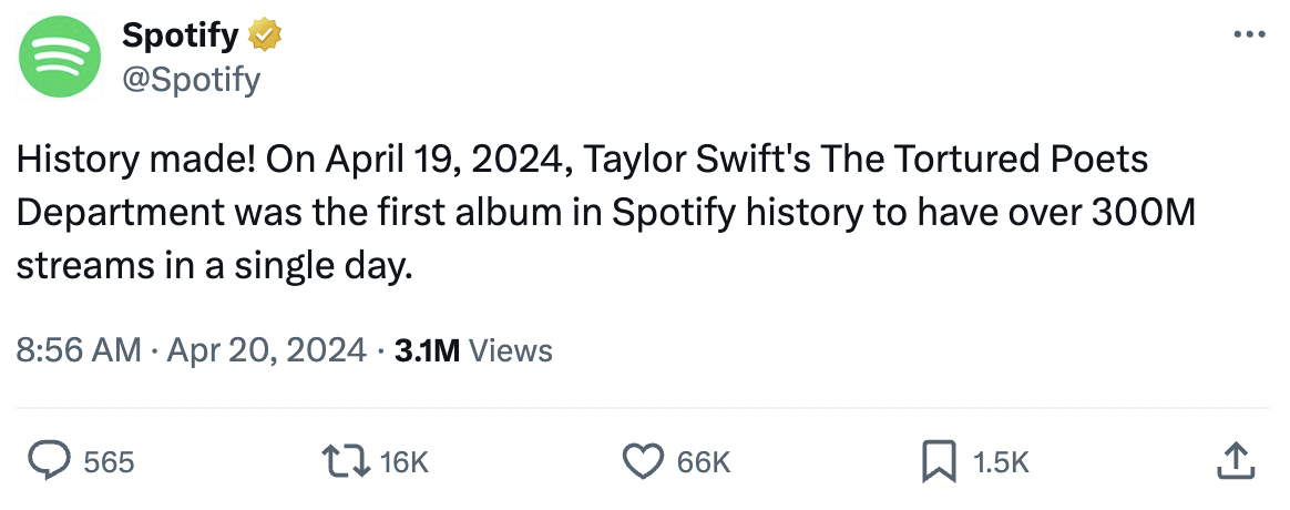 Swift’s double album immediately broke records (including becoming the first album to reach 300M streams on Spotify in its first day and over a billion in its first week), and rightfully so.