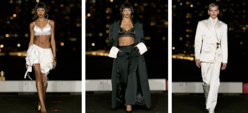 His opening look, which consisted of a white, lacey satin bra and a ruffled mini skirt paired with clunky, gold bracelets, hoop earrings and a pair of stilettos was no exception to his alluring, yet edgy inspiration. The model’s walk down the runway was enticing as she pointed at and side-eyed spectators as if to say, “What are you looking at me for?” This first encounter with the model poked fun at the stereotypical idea of a fashion show. What one might expect to be a serious, uptight event in this case was a fun yet advanced production.