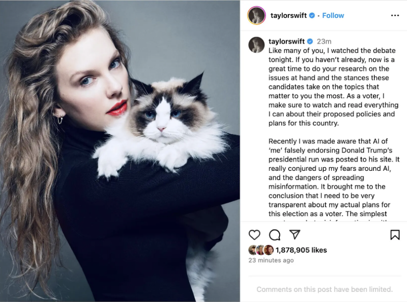 Taylor Swift posted on Instagram that she supports Kamala Harris because “she fights for the rights and causes I believe need a warrior to champion them.” (Source: Taylor Swift Instagram)
