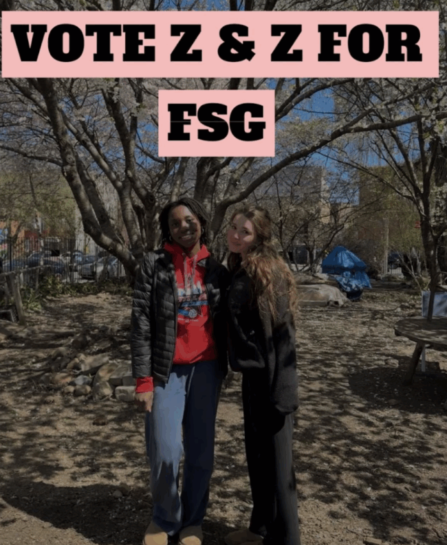 If you haven’t spotted us in the City Sem classroom all semester (though between Rube Goldberg and spring break trips, you’ve definitely seen us on ECFS’s Instagram), we’re Zoe Gorman (She/Her) and Zena Imafidon (She/Her), and we’re running to be your FSG Co-Presidents.