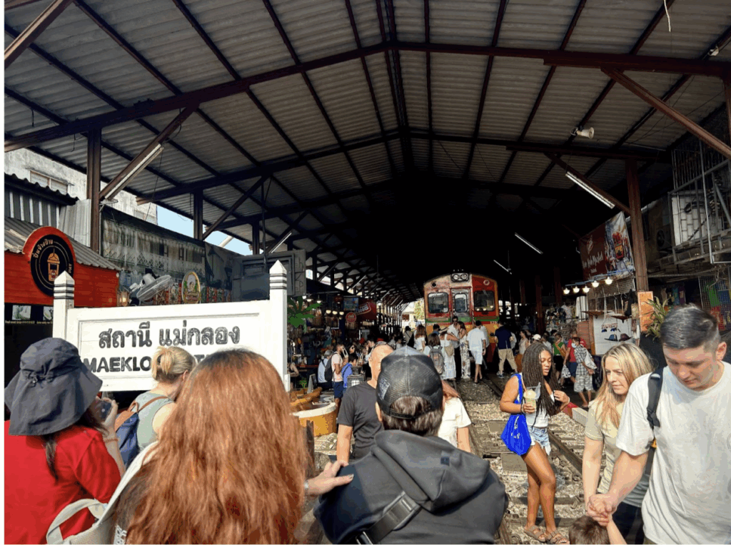 On the 17th, we went to the Mae Klong Railway Market, a market where the umbrellas over market stands get pulled up as trains come by. After this, we went to a floating market where we held snakes and loris before going to a coconut farm and an organic farm.
