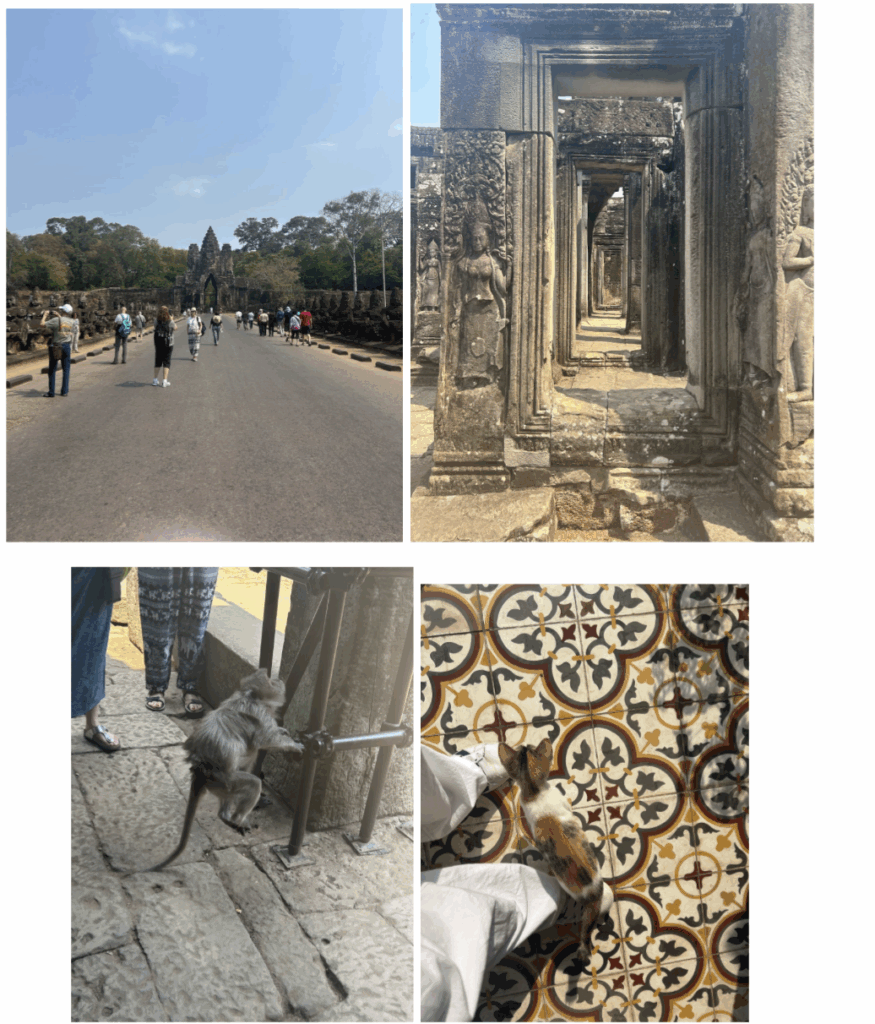 On our fourth day, we toured many more temples, such as Angkor Thom, Bayon Temple, Ta Prohm Temple, Banteay Srei Temple, and the Terrace of the Elephants, and saw many animals.