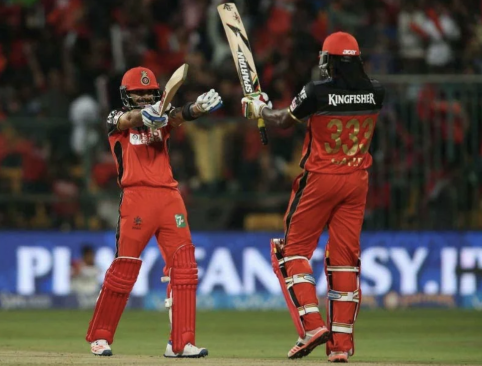 Virat Kohli (left) celebrating with Chris Gayle (right) Source: NDTV Sports