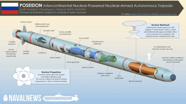These types of weapons are often referred to as “second strike” weapons. The Poseidon would theoretically be used as a retaliatory attack in response to a first-strike nuclear attack. The Russians are essentially demonstrating they would be able to mount a nuclear retaliatory attack against an aggressor’s first strike. This serves as a deterrent. The fact that Poseidon is launched from a remote submarine lends credence to the “second strike” theory.